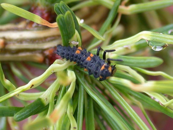 Marienkäfer (hier die Larve) sind Jäger und ernähren sich von Läusen